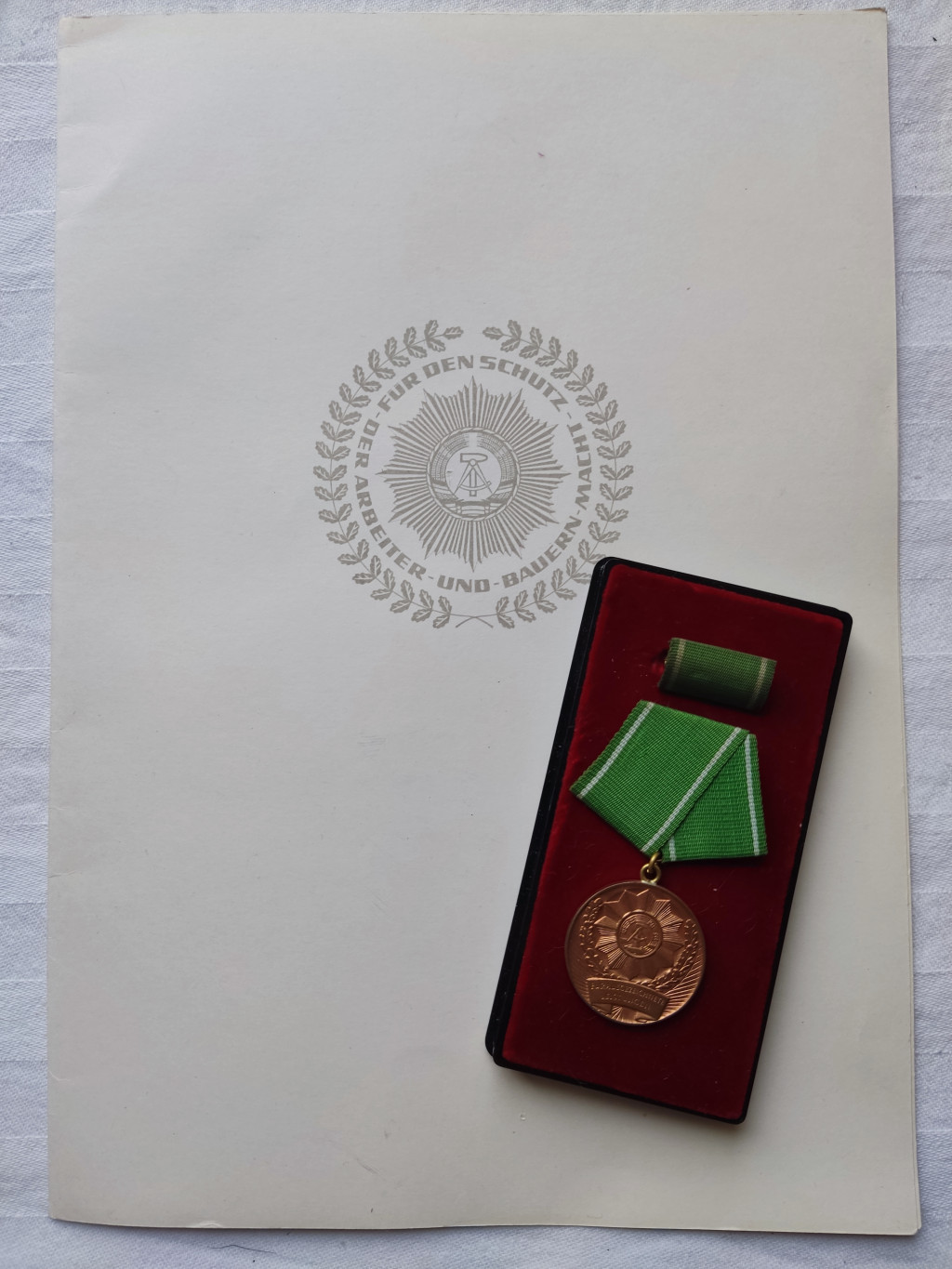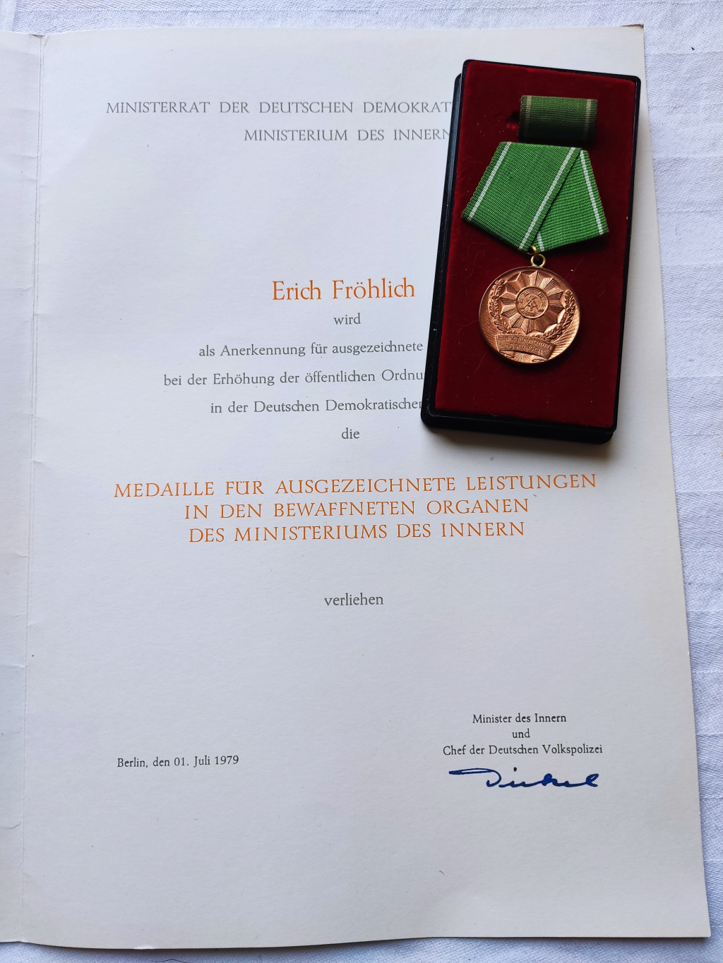 East Germany DDR Police Medal “For Outstanding Achievements” in Bronze with award certificate and case - 300x209mm